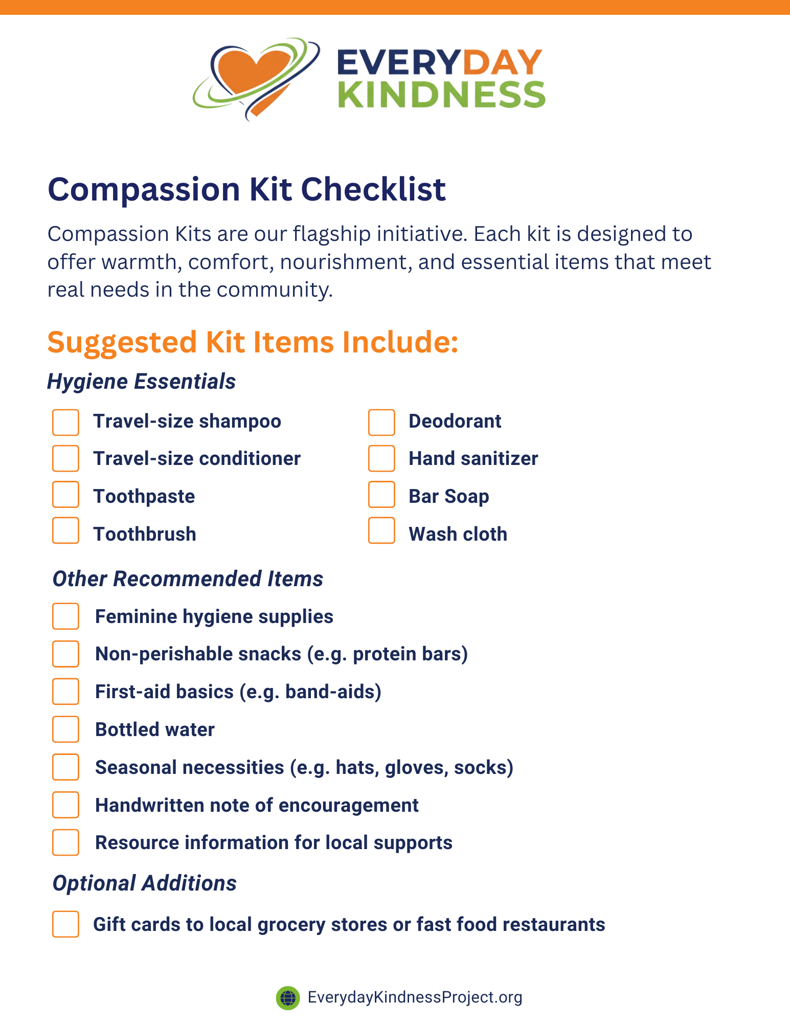 Everyday Kindness invites local organizations, businesses, schools, and faith communities across North Carolina to host Compassion Kit Drives that support individuals and families experiencing housing instability and unmet basic needs.